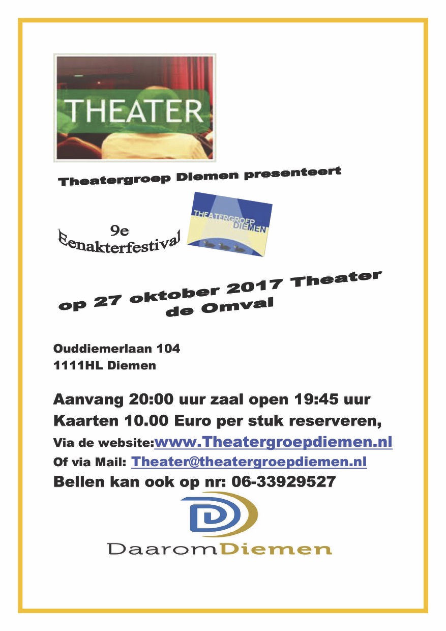 - 27 oktober 2017 speelden we op uitnodiging van Theatergroep Diemen op het 9e Eenakterfestival voor de laatste keer ons stuk: Veerkracht. Het was een hele fijne afsluiting van een mooi theaterseizoen voor onze eenakter!